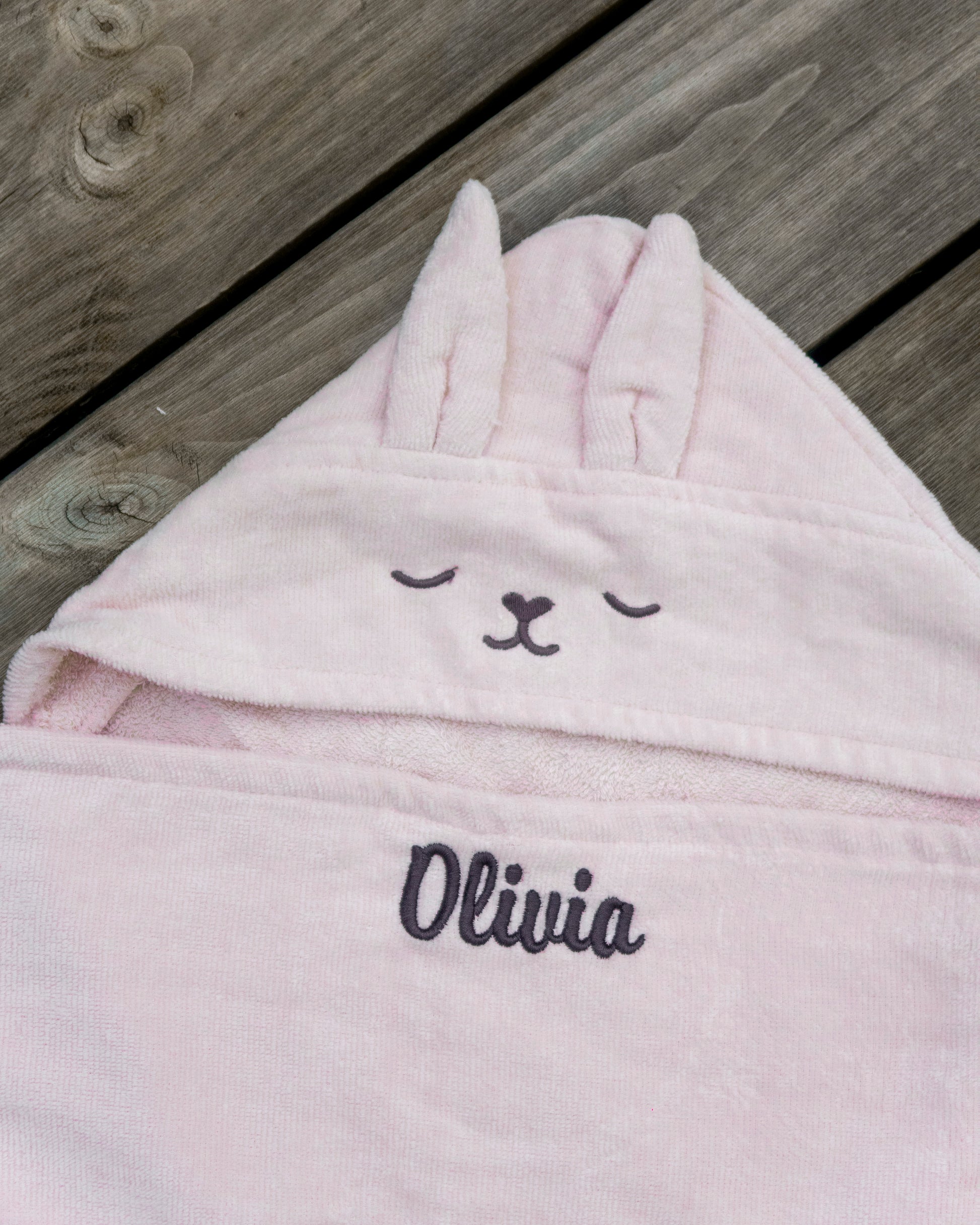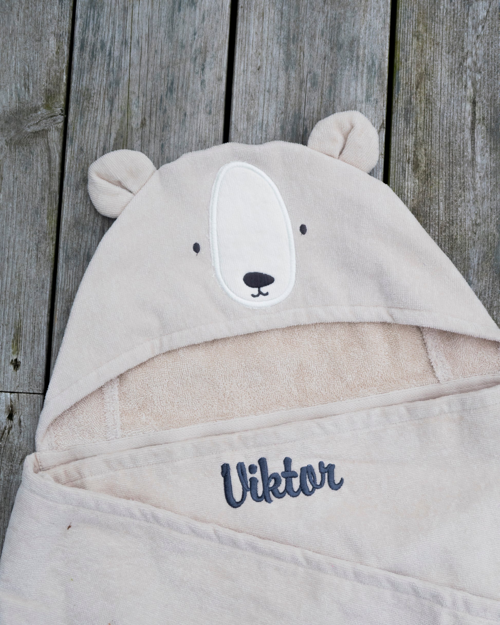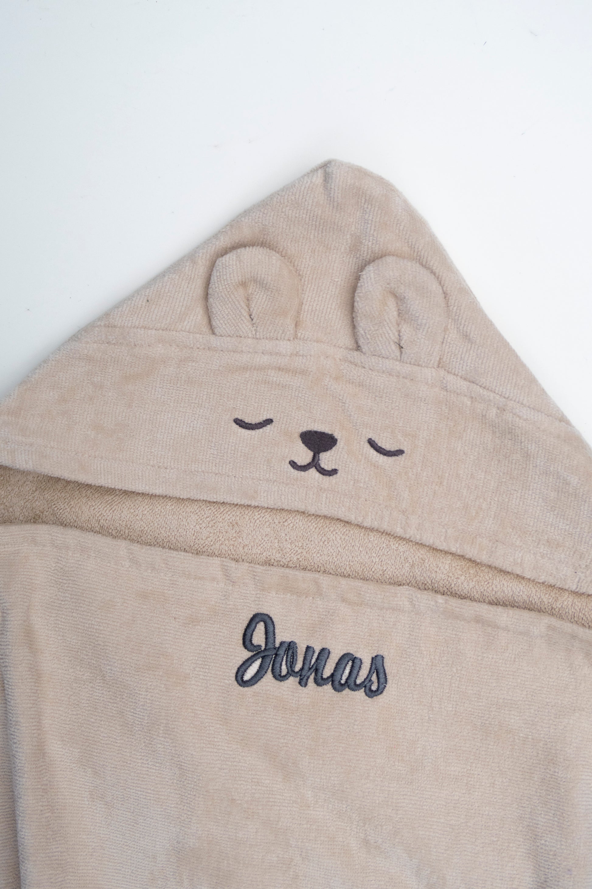 En perfekt gave til barn! Et badehåndkle i myk bomullsfrotté med hette, øreapplikasjoner og hempe i nakken. Navnet broderes langs siden, slik at det er lett synlig under bruk.