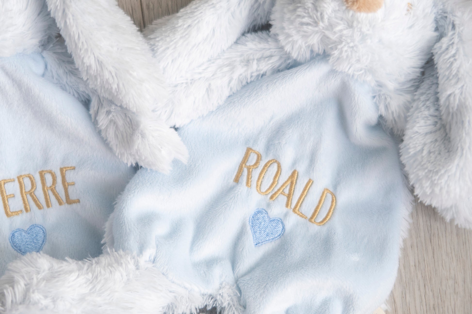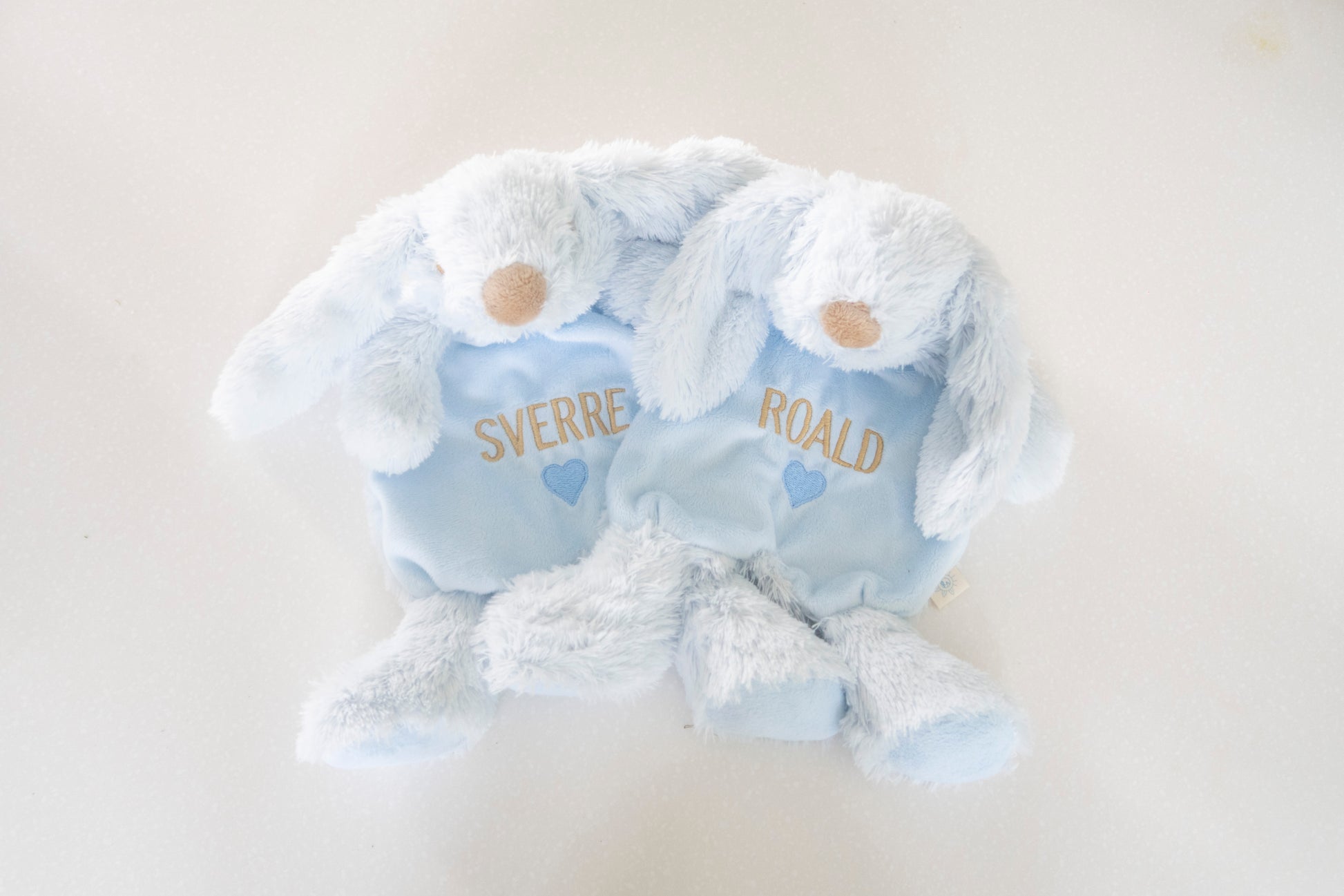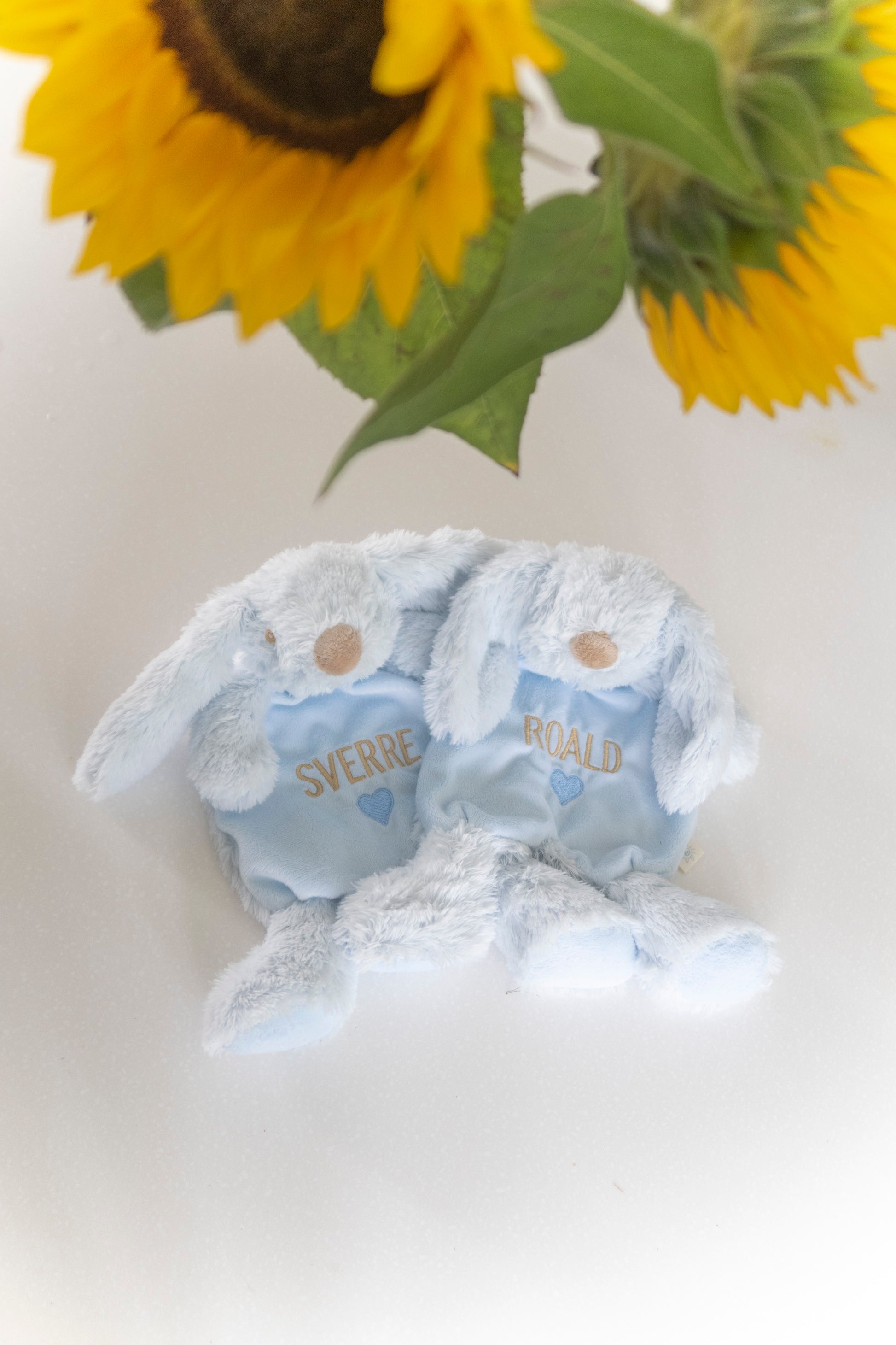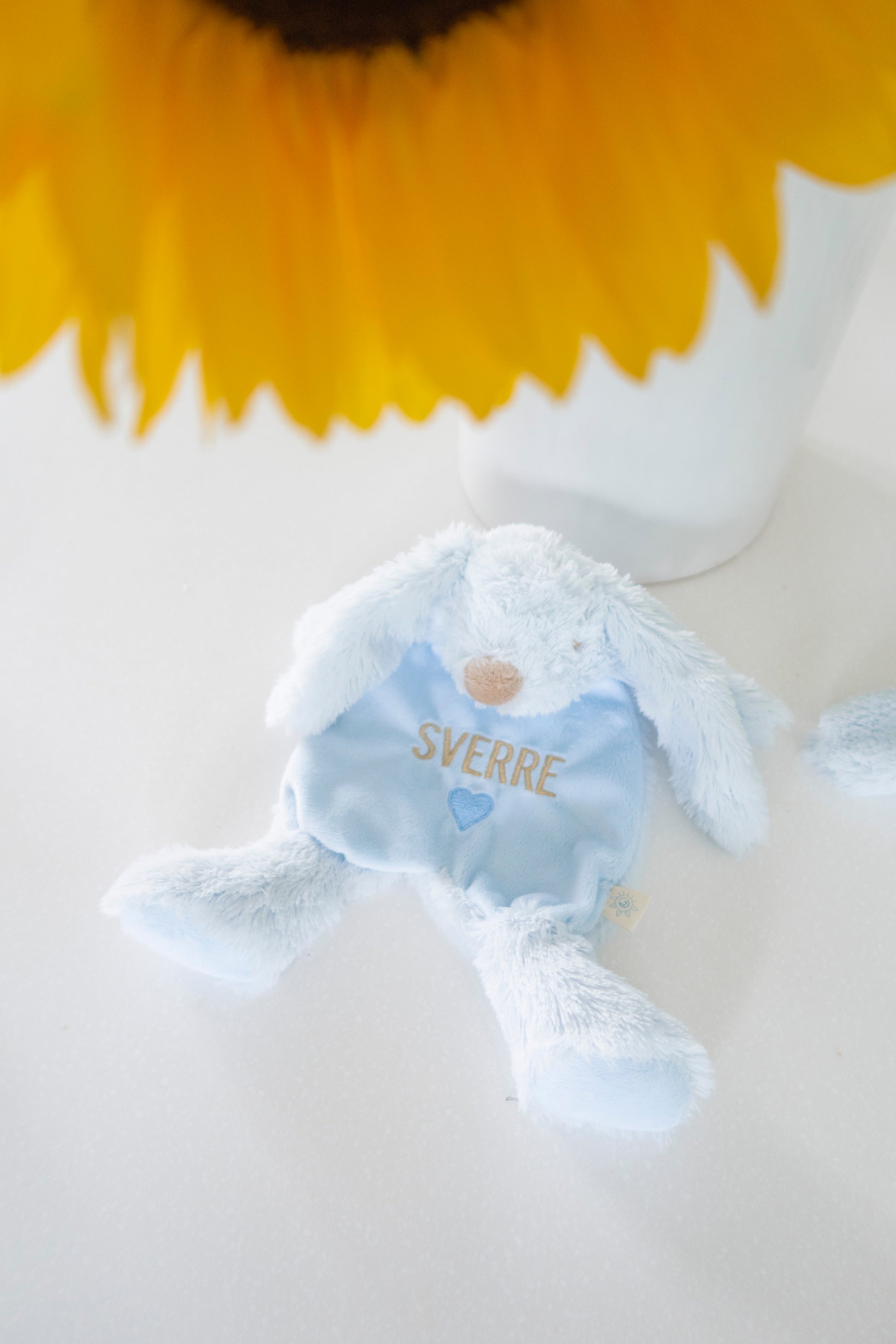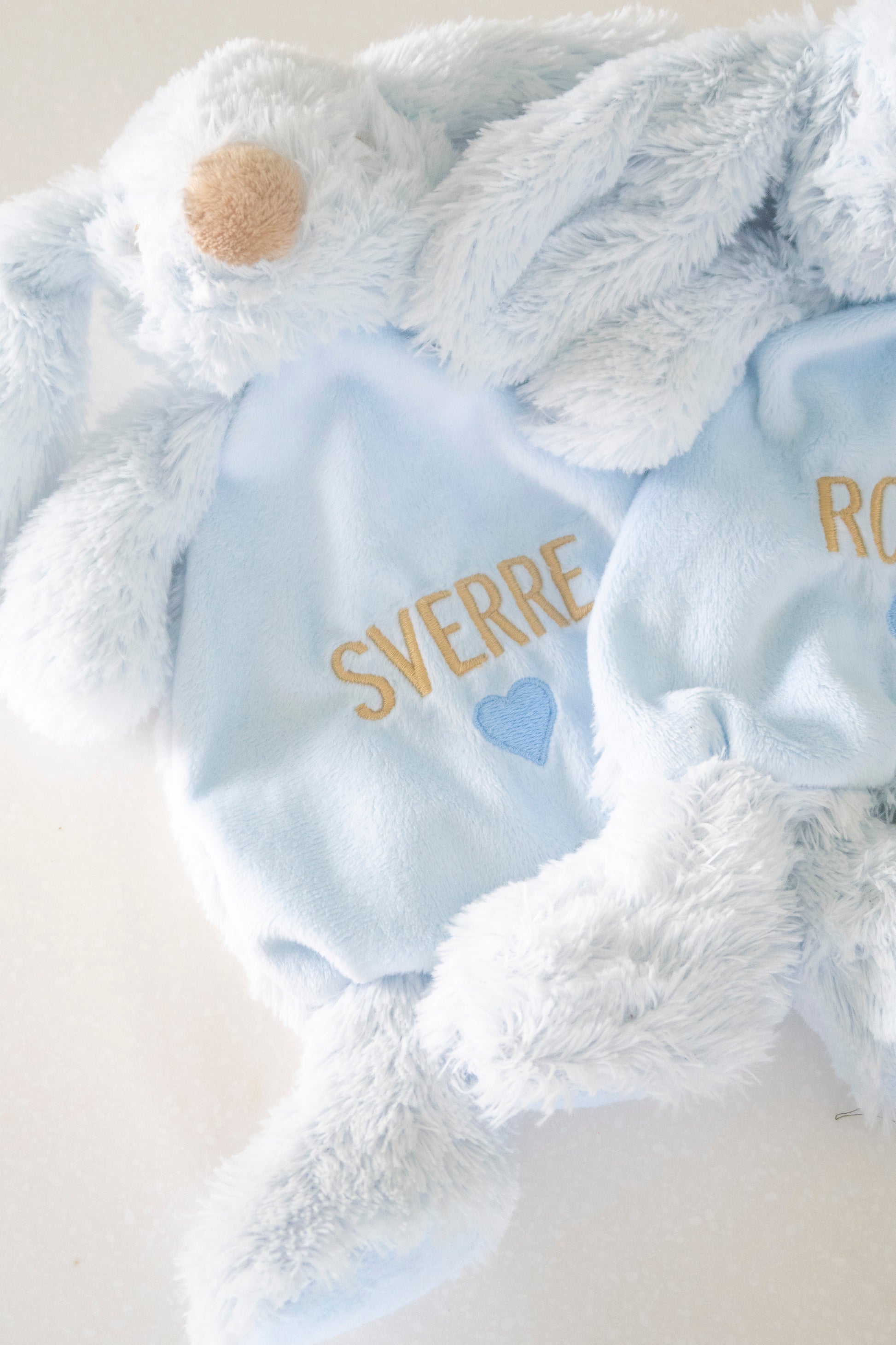 Kaninen har en myk og flat mage som gir plass til brodering av navn. Det gjør den til en nydelig, personlig gave til nyfødte, dåp, navnefest eller bursdag.