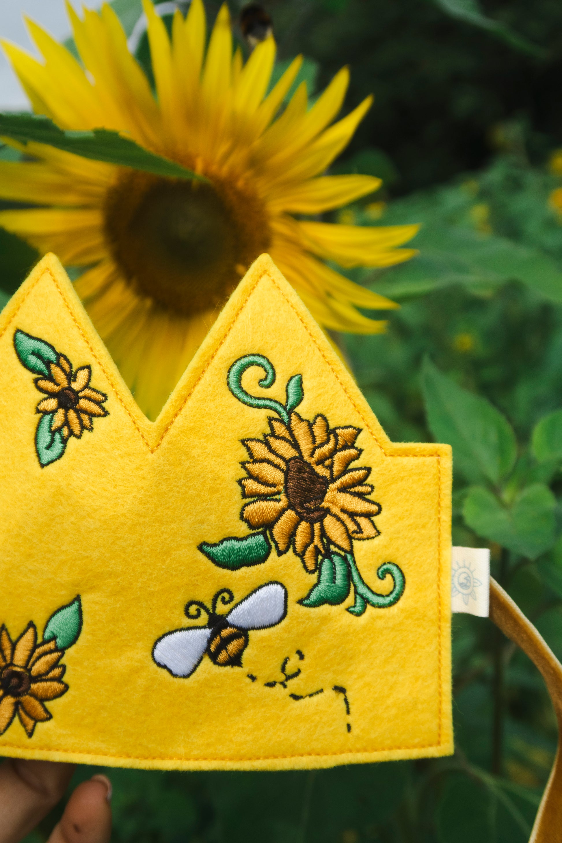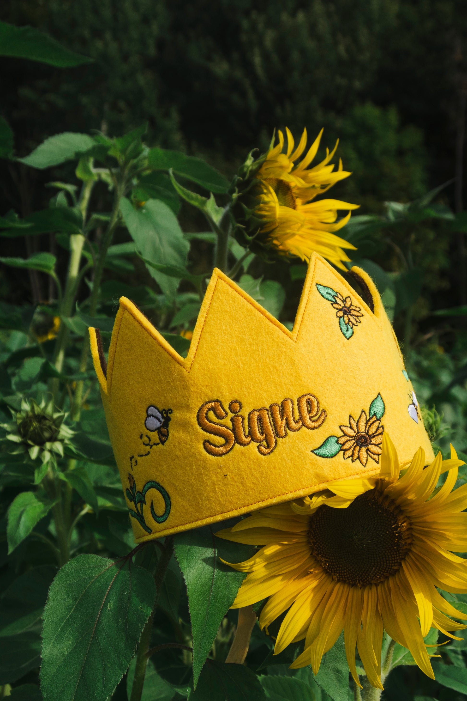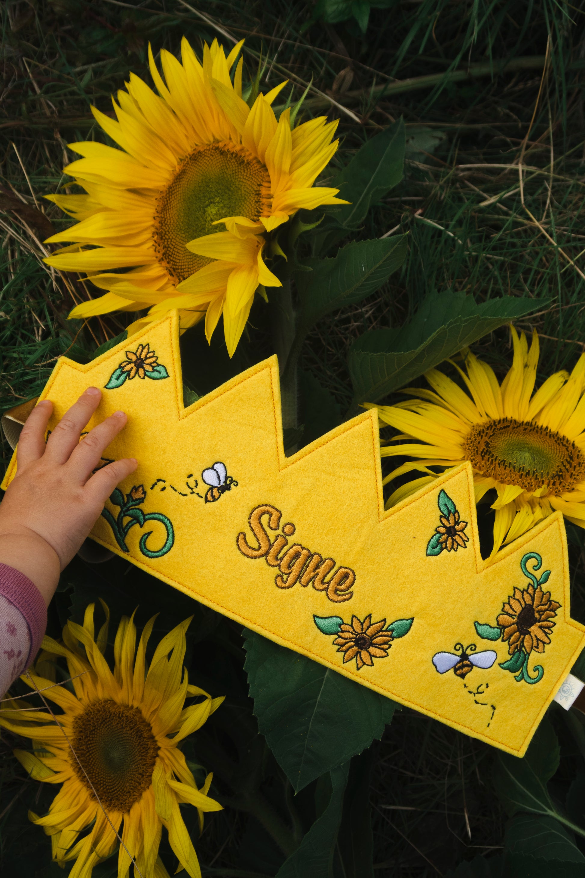 Vår broderte solsikkekrone er laget for små solstråler som elsker farger og blomster. Den passer like godt til bursdag som til utkledning og lek, og gir et lekent og sommerlig preg uansett anledning.
