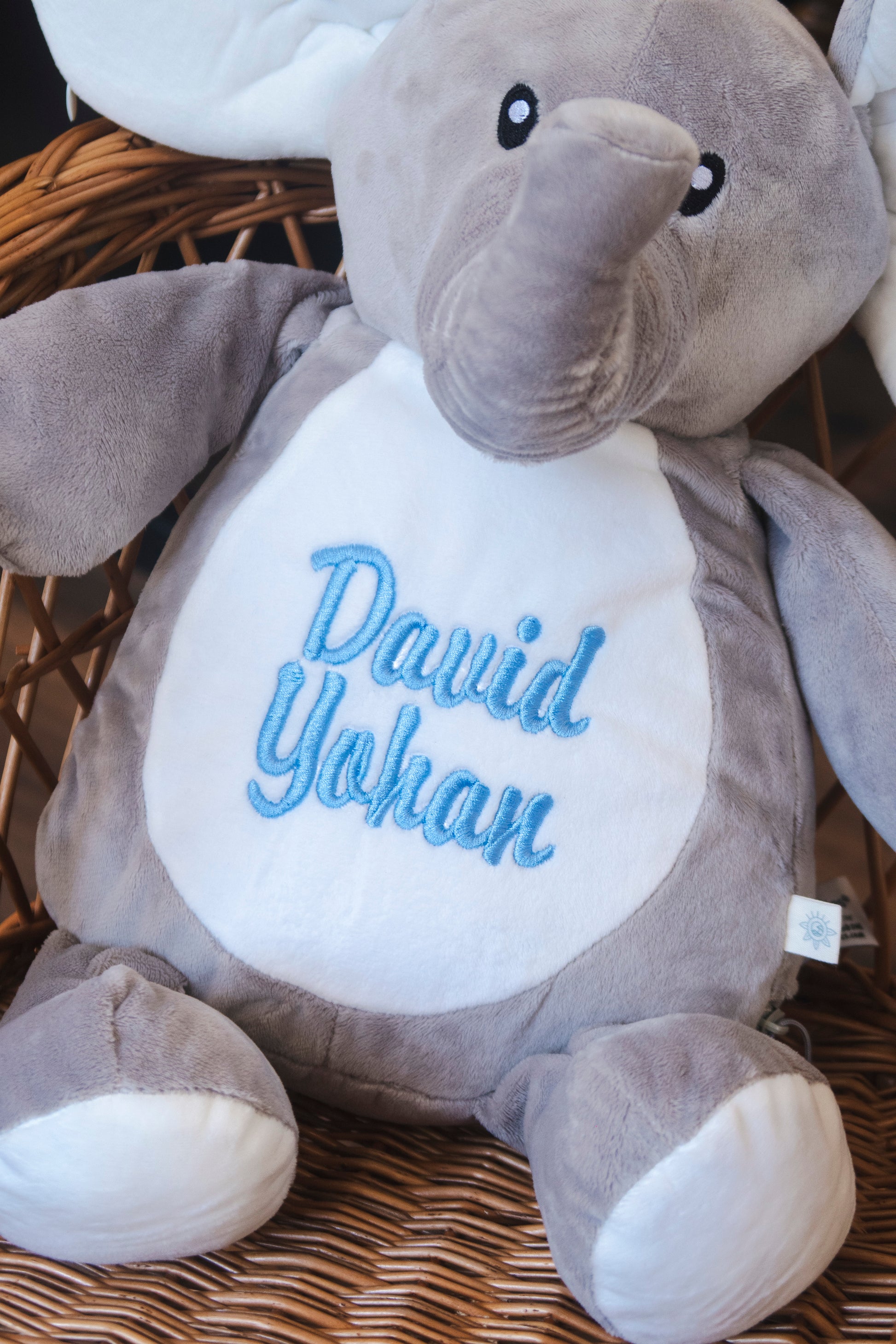 Denne søte og personlige elefantbamsen er perfekt som gave til den lille, om det er til babyshower, fødselsdagen, dåp eller annen spesiell anledning.