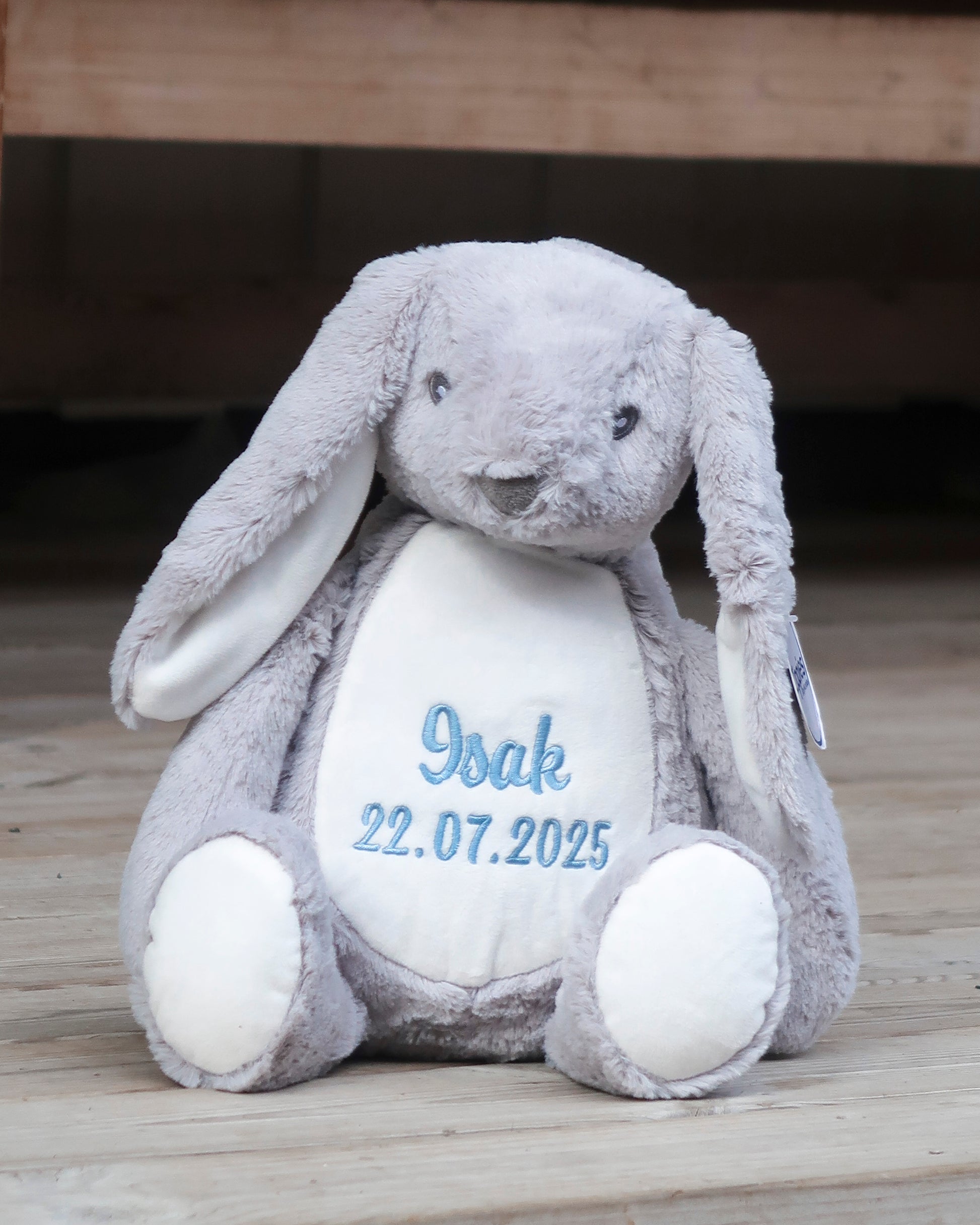 Denne myke og sjarmerende kaninen blir en helt spesiell gave til den lille – perfekt til babyshower, fødselsdag, dåp eller andre viktige anledninger.